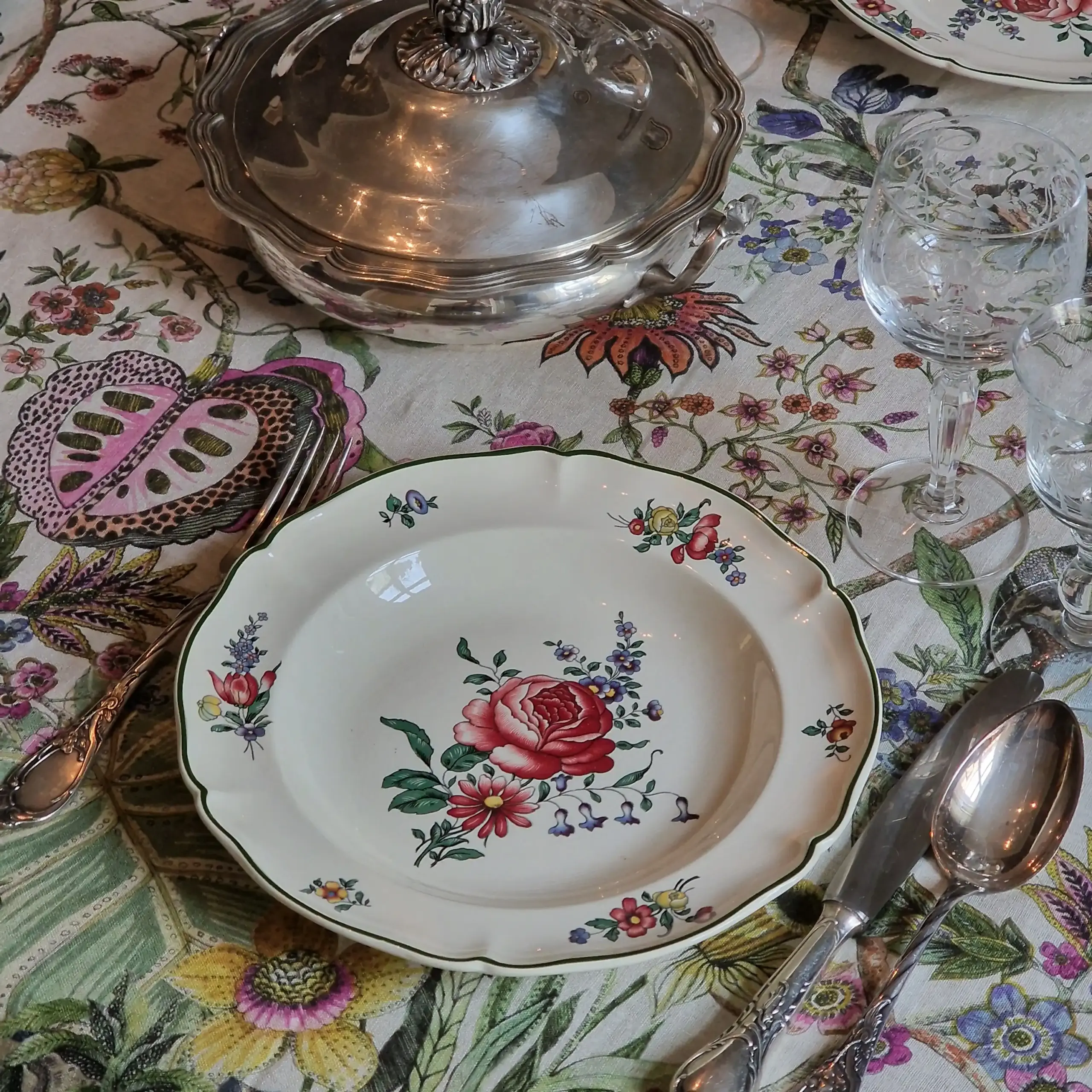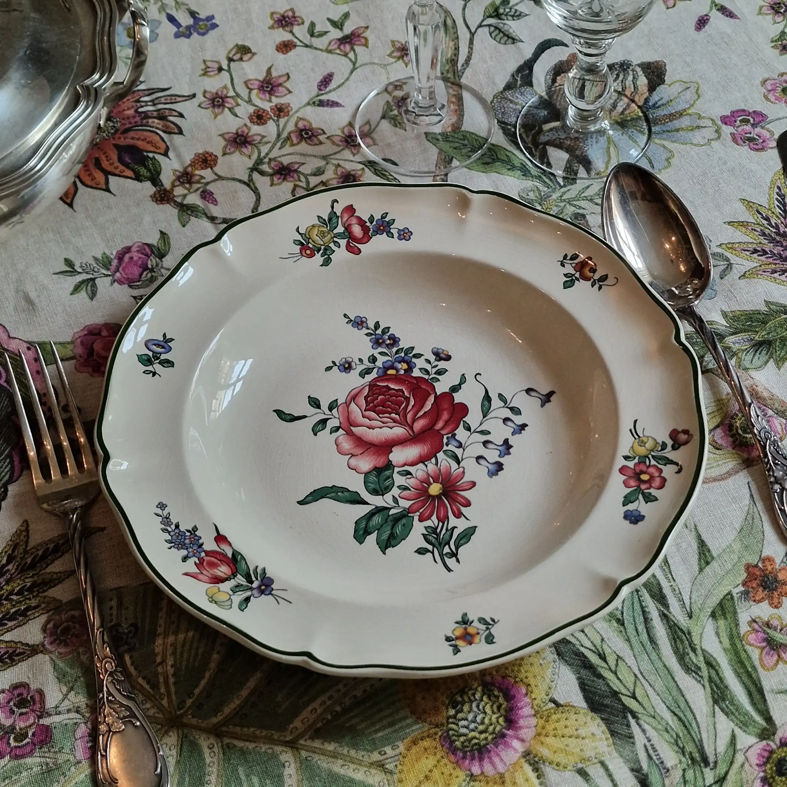 Whether layered onto crisp linen or styled within a more expressive, floral tablescape, these plates bring depth, story, and timeless elegance to every occasion.