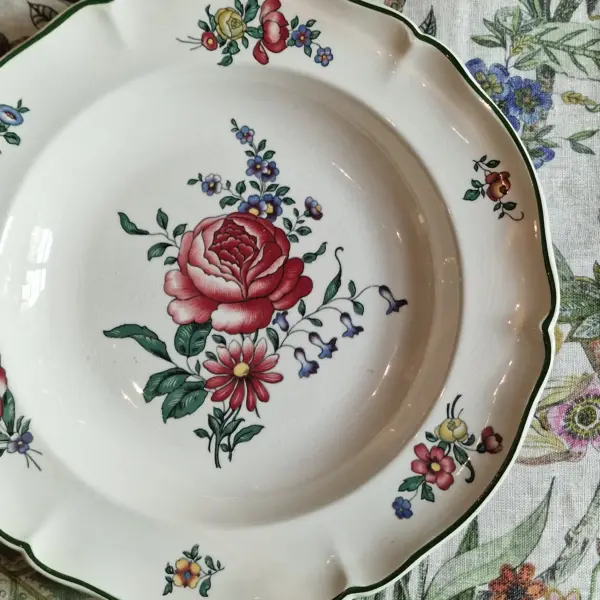 Each plate is adorned with a delicately composed bouquet, centered by a blooming rose in soft crimson hues, accompanied by fine botanical details and scattered blossoms along the gently scalloped rim. The signature green edge frames the composition with quiet sophistication, enhancing its classic, heritage feel.