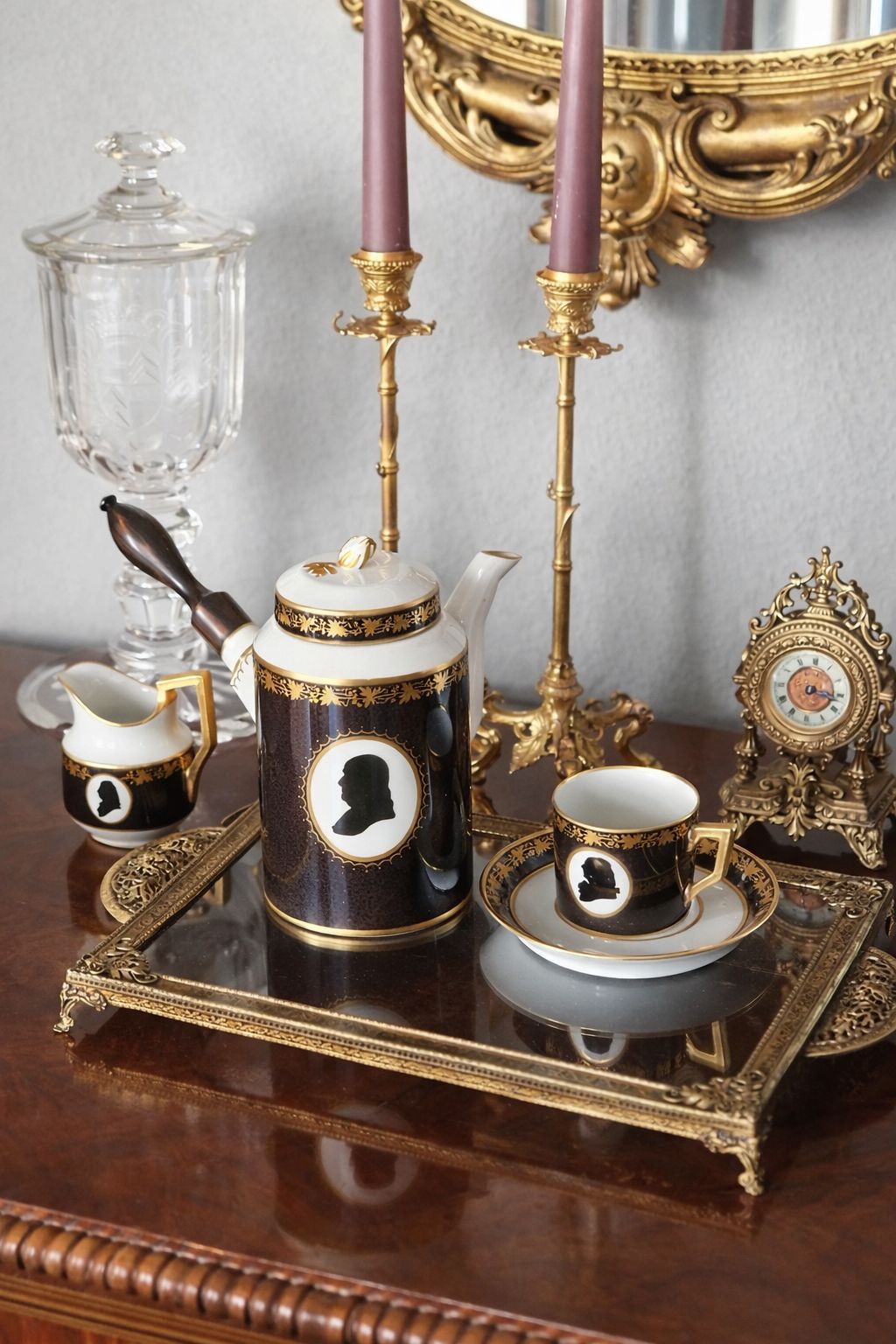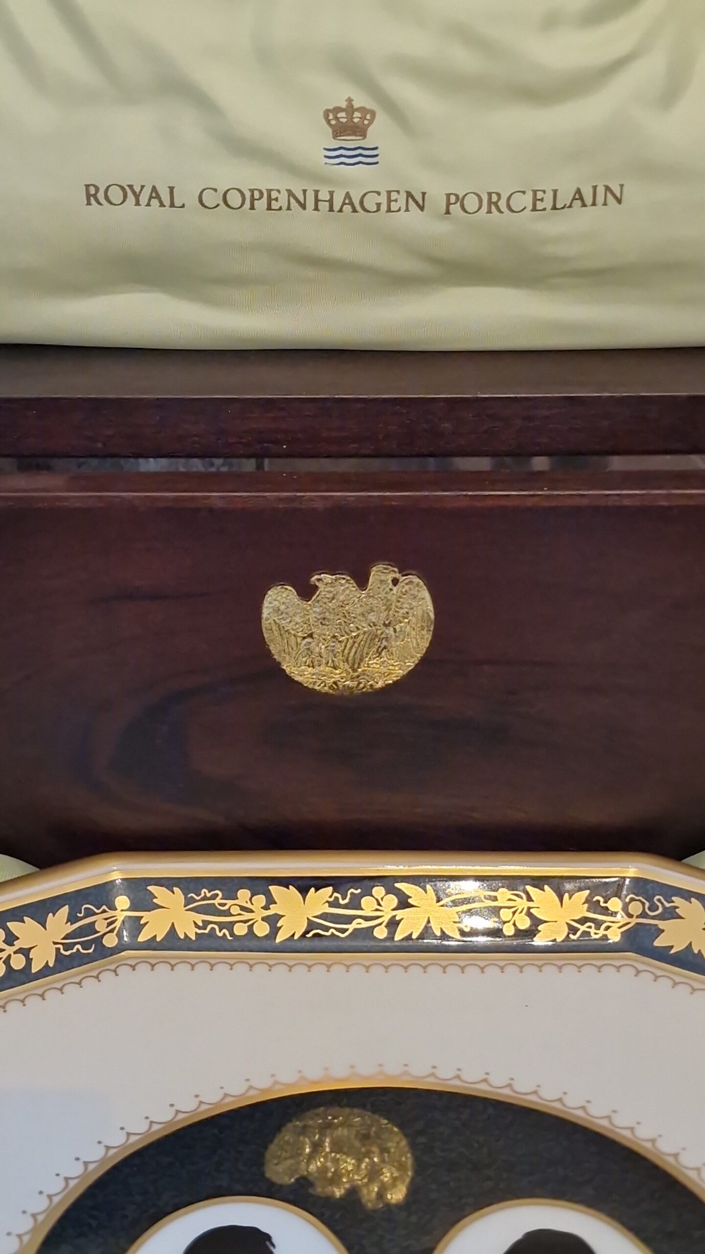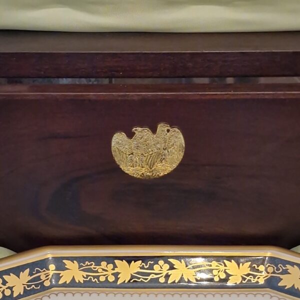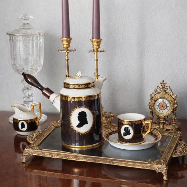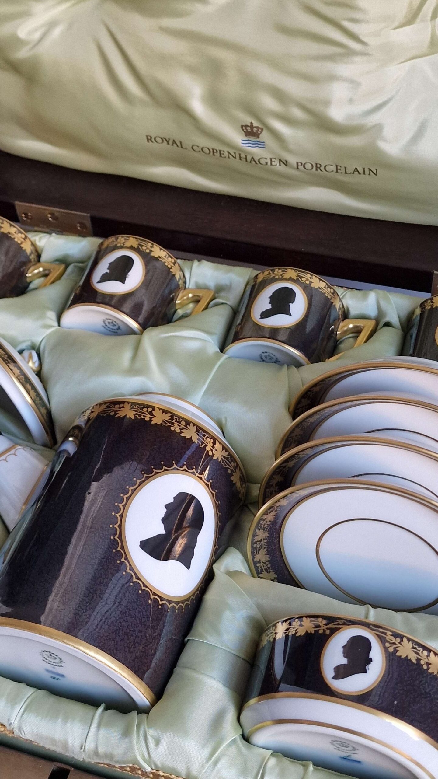 Royal Copenhagen – the colonial coffee service, produced in conjunction with the 200th anniversary of U.S. Independence on July 4, 1976. Features handcrafted mahogany case with loose bottom. Interior lined with light green silk and trim. Porcelain is painted in anthracite Gray and plated with 24 CT gold. The motifs are silhouettes of the nine leading figures of the U.S. associated with the declaration of independence in 1775. Set is produced in an edition of 300. The first set was given to the president of the United States.